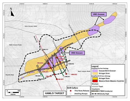 - Assay results received for the initial seven holes at Hamlo indicate a pyrite-rich VMS mineralized system, which appears to increase in metal content at greater depths. This is consistent with typical VMS metal zoning.