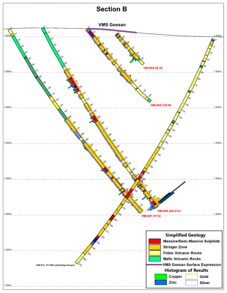 - HM-006 ended in 10.90 m of 0.291 g/t Au and 1.36% Zn from 292.15 to 303.05m (See Figure 5: Section B).