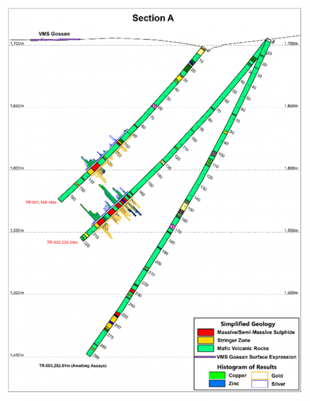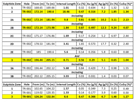- Drill hole TR-002 intersected 18.46 meters of 1.34% CuEq comprised of 0.47% Cu, 1.85% Zn, 0.32 g/t Au, and 7.2 g/t Ag and 8.71 m of 1.04% CuEq comprised of 0.56% Cu, 0.65% Zn, 0.29 g/t Au, and 5.14 g/t Ag (See Table 1).