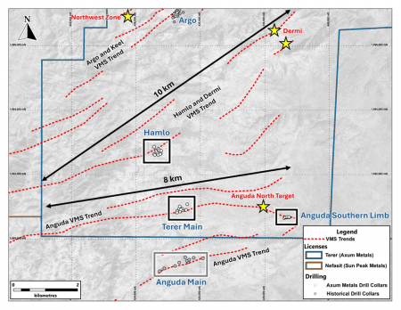 The drill results at Terer and Hamlo, combined with findings from Anguda South, confirm a significant VMS system extending over 10 km, validating the geological model and exploration methods used by Sun Peak. The VMS trend is supported by mapped VMS gossan outcrops, hydrothermal alteration zones, VTEM airborne geophysics, geochemistry, and gravity anomalies, including the large gravity target at Anguda North.