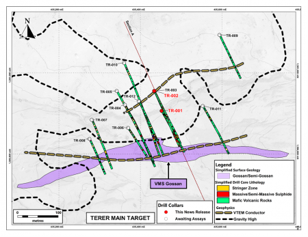 - The Terer VMS zone is located 2 km west and directly along strike of the Anguda North gravity high anomaly, which will be tested in the next drilling phase.