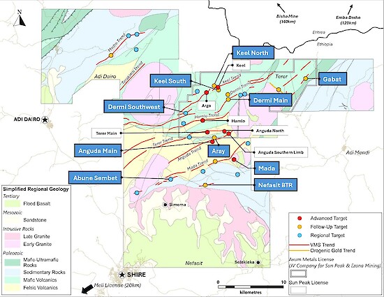 February 27, 2025 – Vancouver – Sun Peak Metals Corp. (“Sun Peak” or the “Company”) (TSXV: PEAK | OTCQB: SUNPF) is pleased to announce that several new gold-rich VMS gossans representing new VMS targets, have been identified at the Shire Project in Ethiopia, with assay results returning up to 29.2 g/t gold and 118.0 g/t silver. These new VMS “pipeline targets” have been discovered through ongoing prospecting and geological mapping as part of the Company’s target development work.