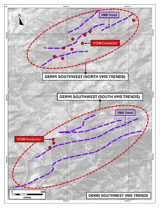 - Sub-regional geological mapping at Dermi Main revealed two sub-parallel VMS trends, oriented northeast-southwest.