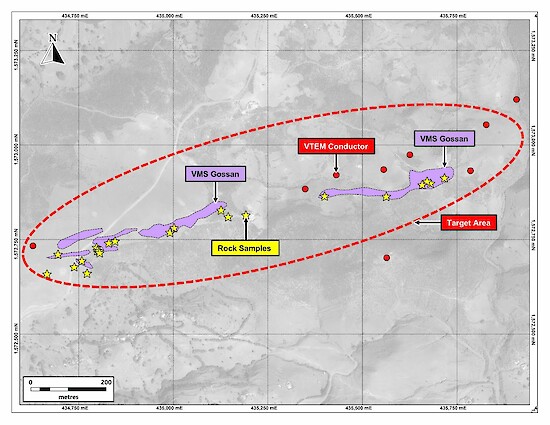 - The new VMS gossans will also be investigated for copper-zinc potential within the primary massive sulphide zone below the oxidize cap.