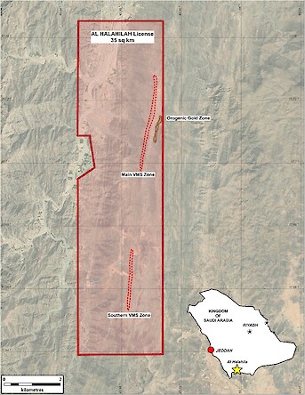 - The VMS copper-gold target covers nearly 235 km², with the license awarded in an auction in Autumn 2024. Surface samples have been tested, initial gravity work completed, and trench sampling is planned. The project comprises of three sub-parallel prospects trending NNW–SSE and is associated with extensive evidence of ancient mining activities, including pits, trenches, and slag. The Al Miyah Main prospect extends 400 m along strike and contains trenches, pits, and graphitic mudstone. Hishashat, located 6 km to the west, measures 400 m by 70 m and hosts ancient slags at a rhyolite-mafic contact. Western Exhalite, 13 km to the west, features silica-rich gossanous exhalite outcrops.