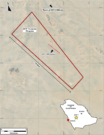 - Afif 1 (76 km²) – Discontinuous 2 km long by up to 250 m wide, north-northwest oriented VMS gossan and associated hydrothermal alteration (Figure 5).