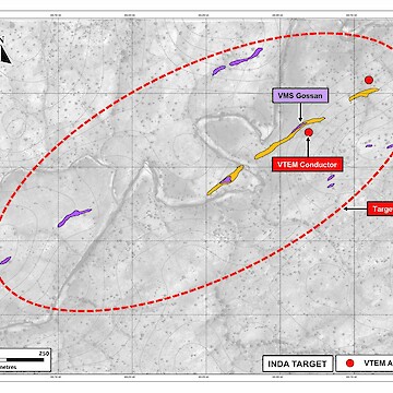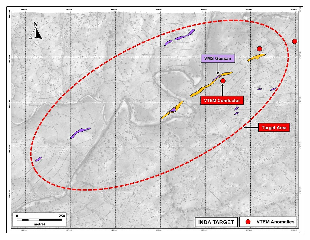 At the Inda VMS target, geological mapping has identified over two kilometres of northeast-southwest trending, sub-parallel VMS gossans. These zones coincide with both gravity anomalies and VTEM conductor responses. Ground-based TDEM surveys are planned to support the development of diamond drill targets.