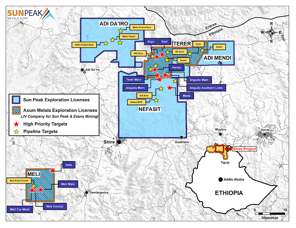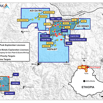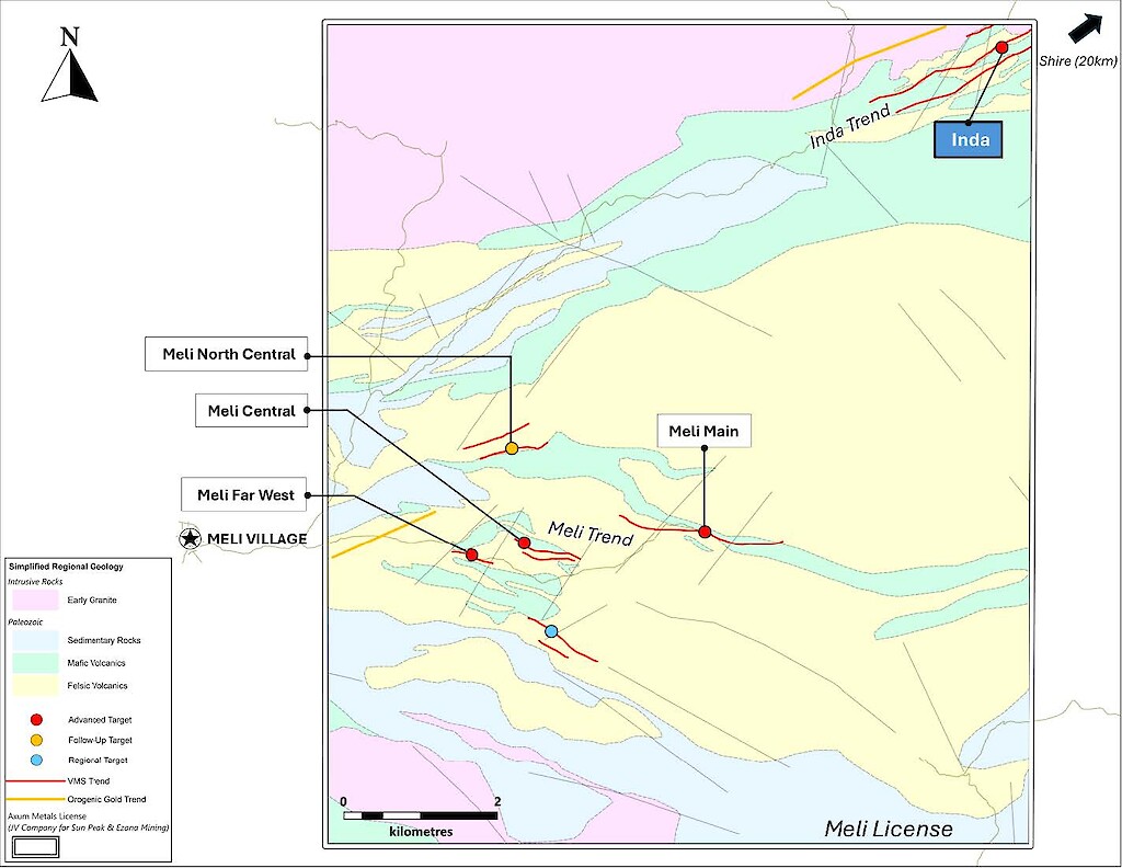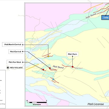 The Meli license, a joint venture with Ezana Mining, is a 100km² exploration area with a volcanic massive sulfide (VMS) trend extending over 10 kilometers in length. Ezana has mined the main VMS gossan, which was exposed for approximately 700 meters by 20 meters, with defined gold resources totaling 70,000 ounces at a grade of 6.23 grams per ton.