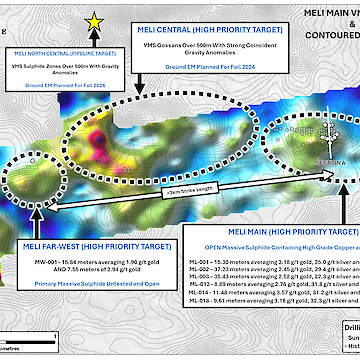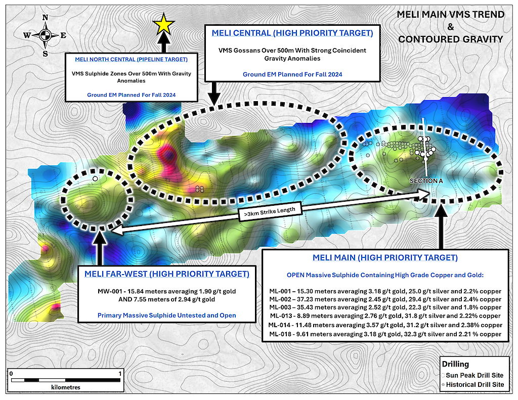 Exploration work at Meli has primarily focused on a greater than 3km long, east-west oriented VMS trend, containing targets such as Meli Main, Meli Central, and Meli Far-West. The trend is anchored at each end by strong gold and copper drill intercepts (Meli Main and Meli Far West), which are part of an extensive VMS system containing intermittent gossans and hydrothermally altered zones. Detailed gravity surveys have revealed strong anomalies and are largely untested by diamond drilling. These strong anomalies will be a key focus of the upcoming drill program.