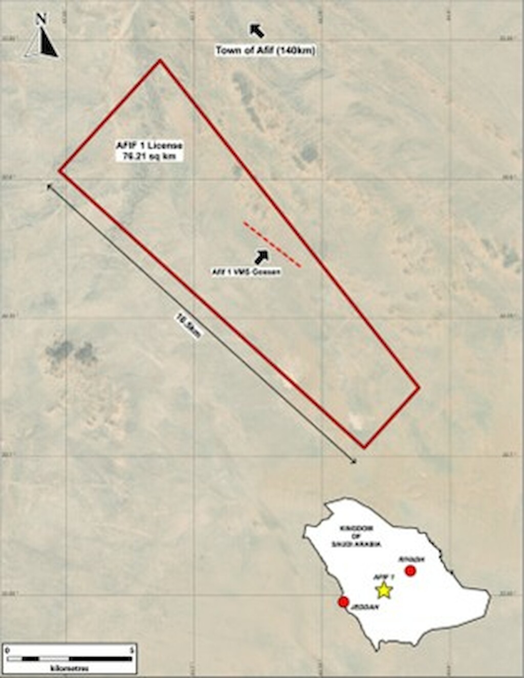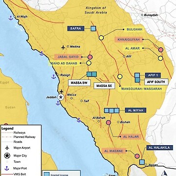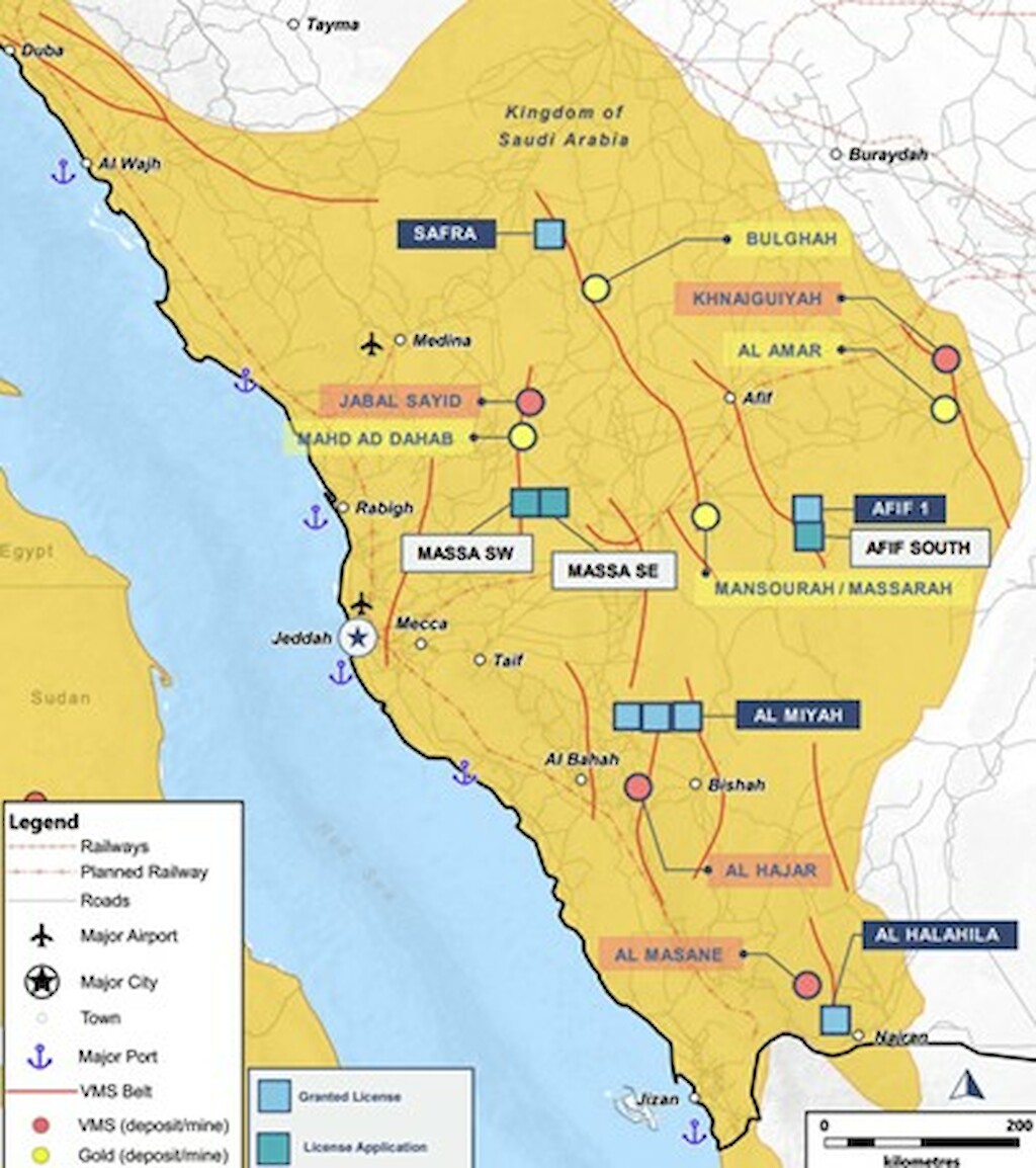 The company’s projects in the Kingdom of Saudi Arabia consist of six exploration licenses covering 340 km2 over four projects: Safra, Afif 1, Al Miyah and Al Halahila. In addition to three pending licenses covering an additional ~700 km2: Massa SW, Massa SE and Afif South.